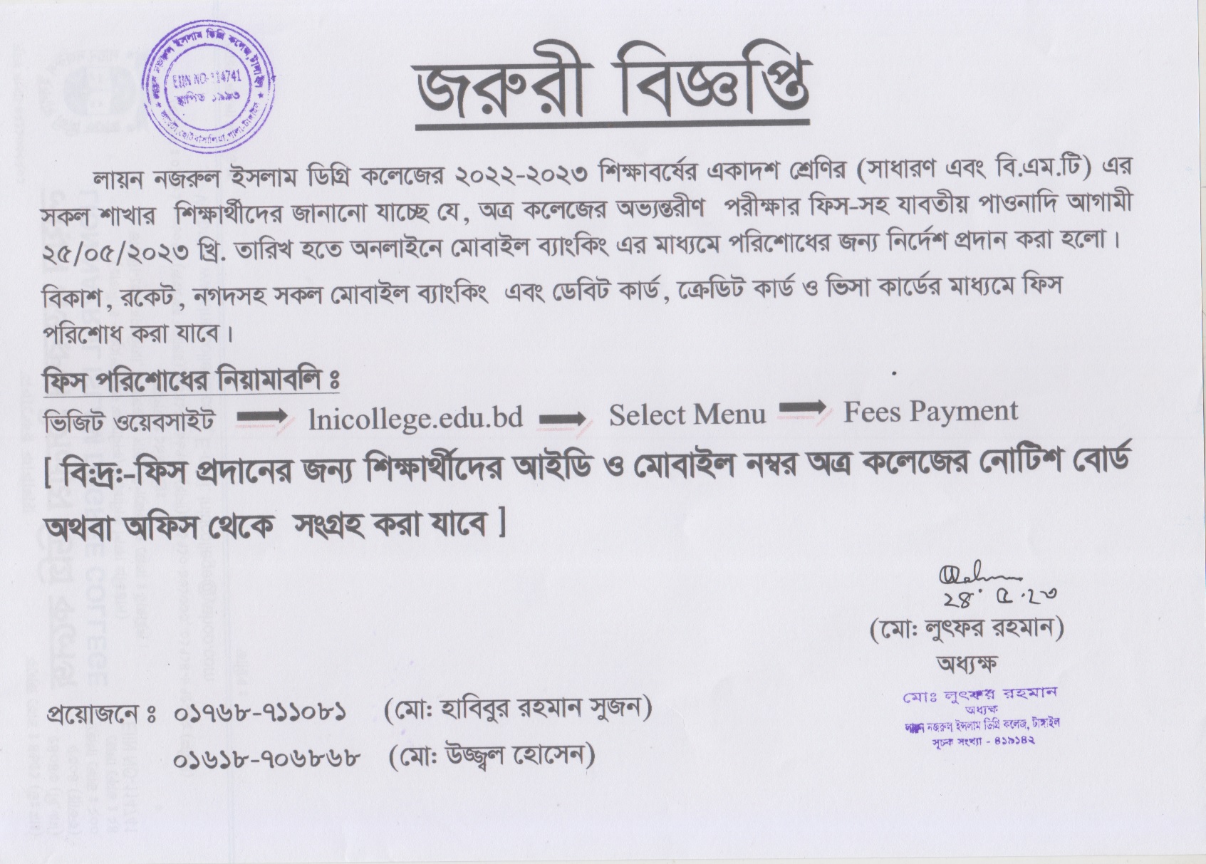 1- লায়ন নজরুল ইসলাম ডিগ্রি কলেজের সকল শিক্ষাথীদের অভ্যন্তরীণ ভর্তি,পরীক্ষার ফিস-সহ সকল পাওনাদি অত্র কলেজের ওয়েবসাইটে Fees Payment অপসনে গিয়ে মোবাইল ব্যাংকিং এর মাধ্যমে পরিশোধের জন্য নির্দেশ প্রদান করা হলো।